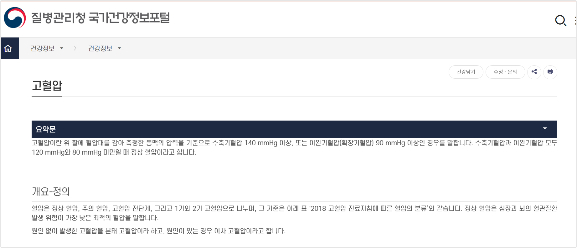 - 정상 혈압: 수축기 120mmHg 미만 / 이완기 80mmHg 미만
